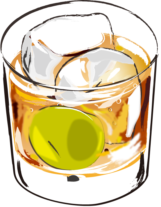 琥珀色が美しい、氷を入れた梅酒ロック。561×721px